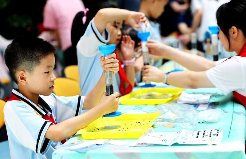 2025年7月5日,小朋友在中国杭州低碳科技馆进行科学实验体验。 新华社发(周方玲摄)