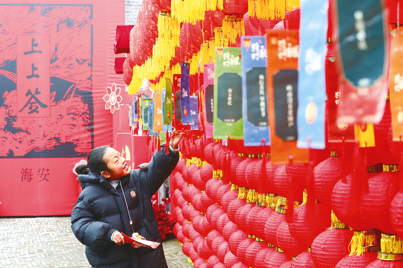 2月10日,小朋友在江苏省海安市博物馆(韩公馆)猜灯谜。新华社发(顾彬斌 摄)