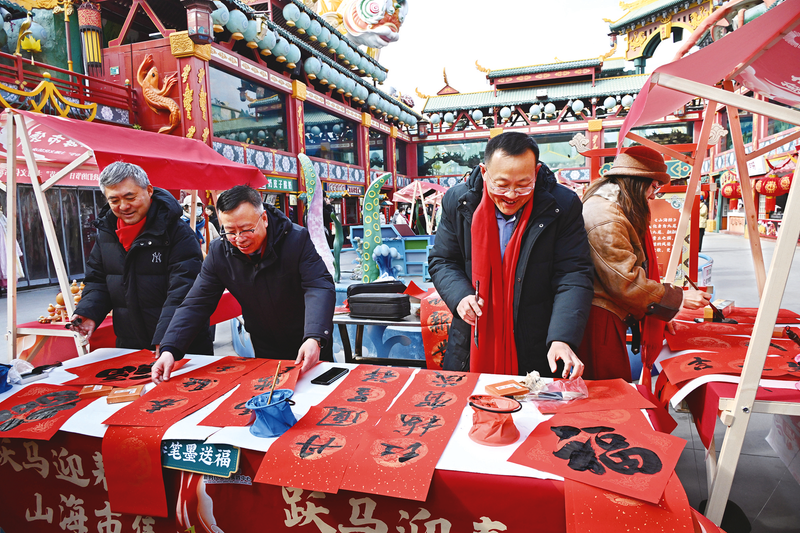 2月10日,在青岛市城阳区山海间不夜城主题街区,书法家在活动现场写对联、送福字。新华社记者 李紫恒 摄