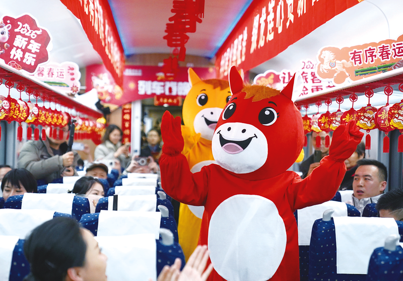 2月10日,在南昌至北京丰台的D138次列车上,列车工作人员在列车“春晚”现场为旅客表演。新华社记者 万象 摄