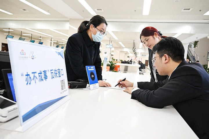 2025年4月14日,银行工作人员在江苏省淮安市洪泽区政务服务中心“办不成事”反映窗口咨询。