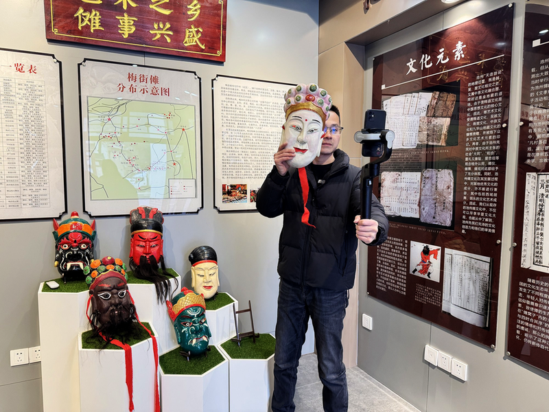 作为当地小有名气的自媒体博主,许鑫磊的抖音账号“乡傩人家”已积累上万粉丝,成了池州傩文化走出大山的线上窗口。这几天,他彻底开启“连轴转”模式,穿梭在展示馆与各个排练场之间,镜头里记录着傩戏排练的每一个细节,每一条视频都藏着傩戏的韵味与新年的期盼。“正月里我们有几十场表演,想让网友们提前感受这份独有的年俗,让更多人爱上池州傩。”许鑫磊一边调整镜头角度,一边和记者说。