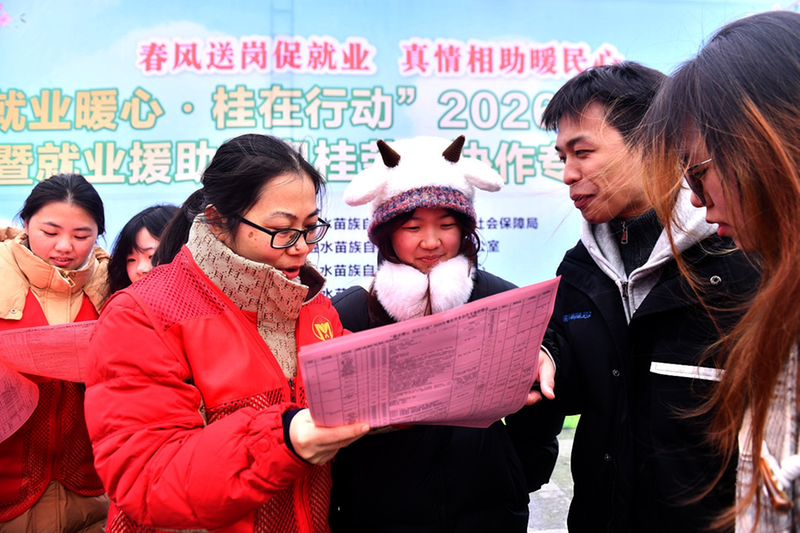 2月8日,在柳州市融水苗族自治县粤桂劳务协作专场招聘会上,人们在了解岗位需求信息。 新华社记者 黄孝邦 摄