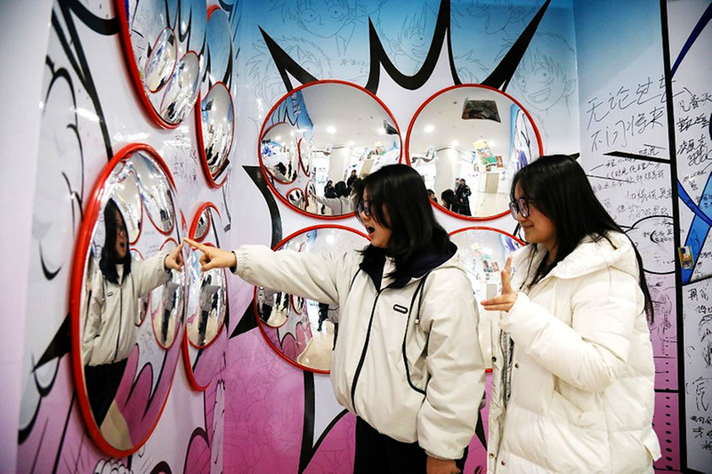 年轻消费者在商之都动漫文化墙前体验哈哈镜。