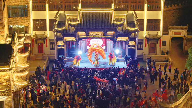 园区内张灯结彩、灯火璀璨,处处洋溢着喜庆祥和氛围。18时30分,伴随激昂的锣鼓声,一条金龙在夜色中翻腾起舞,拉开了活动序幕。古戏台上黄梅戏婉转开唱,书画院内趣味灯谜、陵阳楼广场激光秀震撼上演,现场热闹非凡。