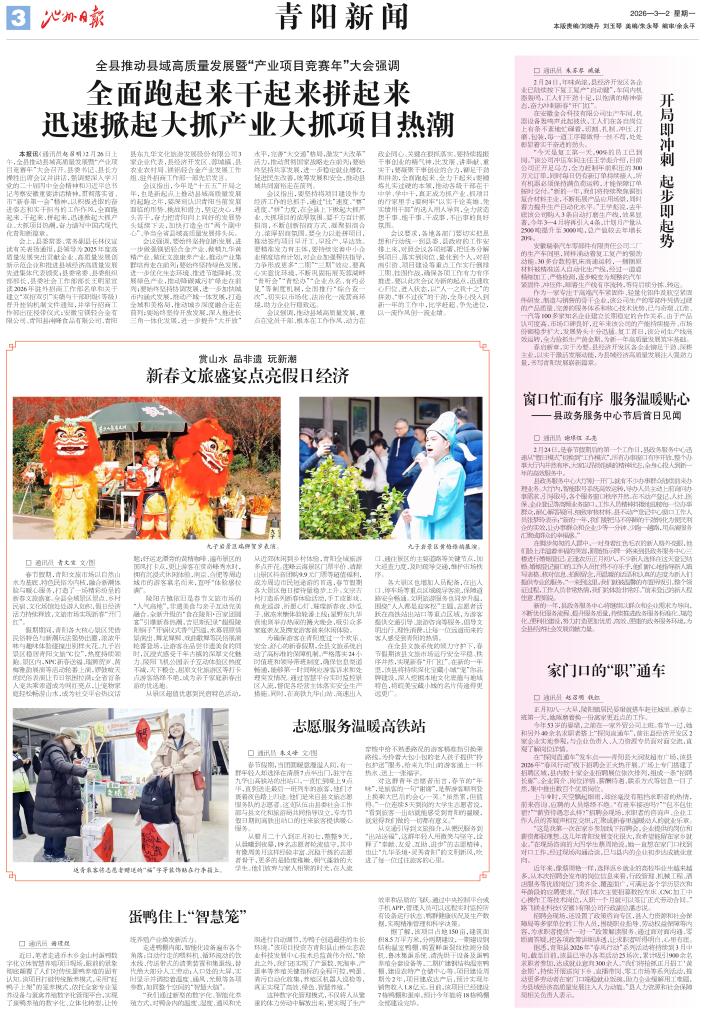 春节假期,青阳文旅市场以自然山水为基底、特色民俗为内核,融合新潮体验与暖心服务,打造了一场精彩纷呈的新春文旅盛宴。全县全域景区景点、乡村民宿、文化场馆处处游人如织,假日经济活力持续释放,文旅市场实现新春“开门红”。