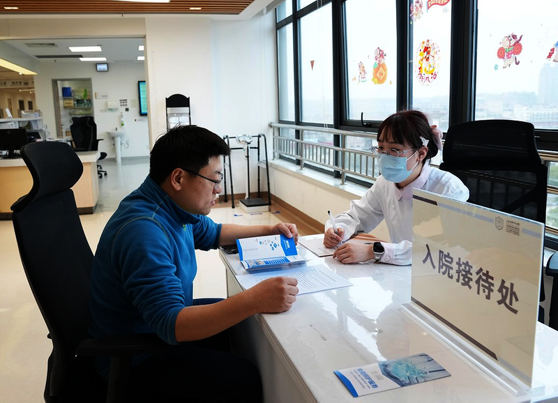 2月26日,在上海市肺科医院外科病区,护士为新入院患者的家属介绍免陪照护服务。