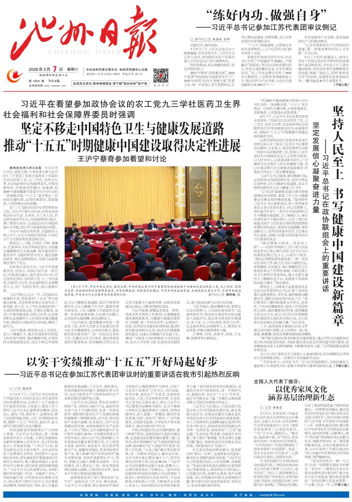 6日下午,习近平总书记在看望参加全国政协十四届四次会议的农工党、九三学社、医药卫生界、社会福利和社会保障界委员并参加联组会时发表重要讲话,为推动“十五五”时期健康中国建设指明前进方向。