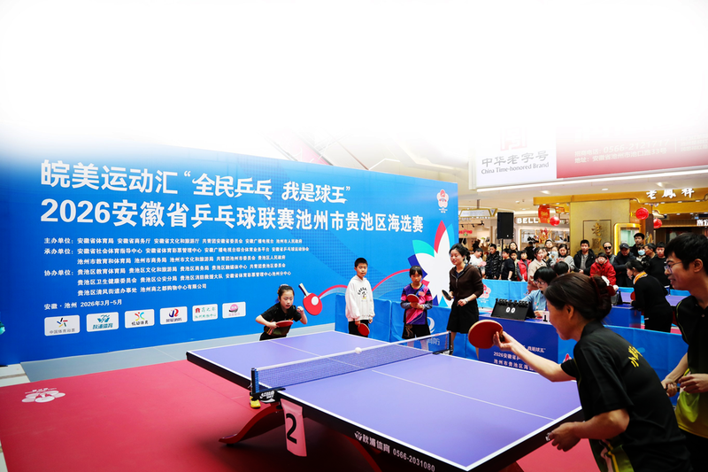 本报讯(记者邱勤/文 左泽川/图)3月7日,皖美运动汇“全民乒乓 我是球王”2026安徽省乒乓球联赛(以下简称“徽乒赛”)池州市贵池区海选赛在主城区商之都购物中心火热开赛。作为“皖美运动汇”2026安徽省全民健身赛事季的核心赛事之一,“徽乒赛”以“全民乒乓 我是球王”为主题,赛期从3月持续至9月。