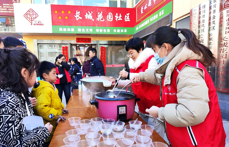 2026年3月3日,宁夏银川市金凤区长城花园社区党委书记赵耐香(右二)与社区工作人员为居民盛元宵,共庆元宵节。 新华社发