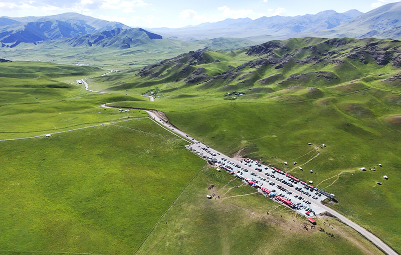这是2025年7月4日在新疆昭苏县伊昭公路沿线野狼谷区域拍摄的停车场(无人机照片)。伊昭公路为新疆自驾游热门线路,江苏泰州援疆投资在沿线修建了7个停车场,既改善游客出行环境,又为当地居民提供了摆摊增收的场所。 新华社发