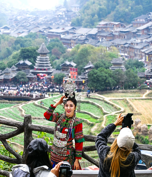 游客在贵州省黎平县肇兴侗寨观景台留影(2025年12月20日摄)。 新华社发