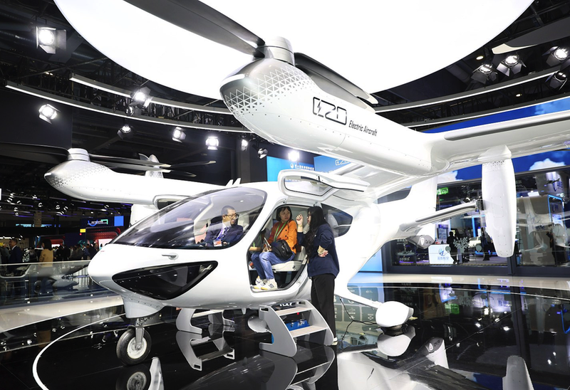 人们在第八届进博会汽车及智慧出行展区时的科技展位体验电动垂直起降飞行器(2025年11月8日摄)。 新华社记者 王翔 摄