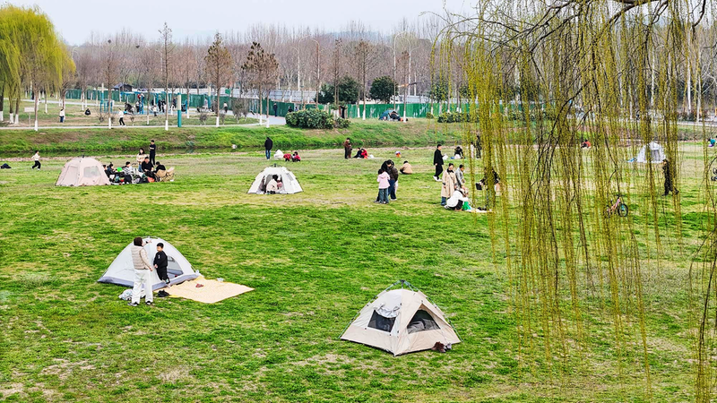 春回大地,平天湖湿地公园草木初萌、景色宜人。市民纷纷来此,或搭帐篷休憩,或漫步嬉戏,尽享春日好时光。图为3月9日平天湖湿地公园一角航拍。记者 张延鹤 摄