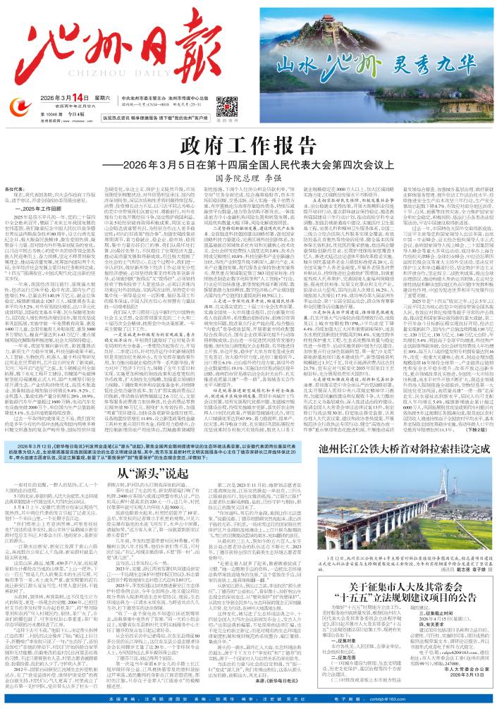 2025年是“十四五”收官之年。过去5年,以习近平同志为核心的党中央团结带领全国各族人民,有效应对世纪疫情等超乎寻常的冲击挑战,推动党和国家事业取得新的重大成就,第二个百年奋斗目标新征程实现良好开局。经济总量实现新跃升,国内生产总值连续跨越110万亿元、120万亿元、130万亿元、140万亿元台阶,年均增长5.4%、明显高于全球平均增速。科技和产业创新取得新突破,全社会研发经费投入年均增长10%,每万人口高价值发明专利拥有量达到16件,攻克一批重大关键核心技术,制造业增加值规模连续16年保持全球第一,产业链供应链韧性和安全水平稳步提升。改革开放迈出新步伐,重点领域改革扎实推进,全国统一大市场加快构建,高水平对外开放不断扩大,制造业领域外资准入限制措施全部取消,货物贸易第一大国地位更加巩固,高质量共建“一带一路”走深走实。民生福祉达到新水平,居民人均可支配收入年均增长5.4%,城镇新增就业累计超过6000万人,巩固拓展脱贫攻坚成果同乡村振兴有效衔接5年过渡期任务圆满完成,脱贫地区农村居民收入增速持续高于全国农村平均水平,基本养老保险全国统筹稳步实施,劳动年龄人口平均受教育年限增加到11.3年, (下转2版)(上接1版)人均预期寿命提高到79.25岁,人民群众文化生活更加丰富多彩。生态文明建设取得新进步,地级及以上城市空气质量优良天数比例提高到89.3%,森林覆盖率提高到25%以上,成为全球森林资源增长最快最多的国家,构建起全球最大、发展最快的可再生能源体系。安全保障能力实现新提升,粮食、能源资源、金融、网络等重点领域安全能力建设明显加强,社会大局保持稳定,牢牢守住了不发生系统性风险底线。经过艰苦奋斗、不懈努力,“十四五”规划《纲要》确定的20项主要指标、17方面重大战略任务、102项重大工程项目胜利完成。