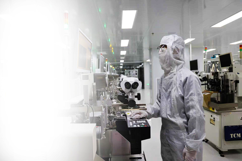 图为丰芯半导体生产车间内,技术人员正查看新产品在键合工序打线的状态。