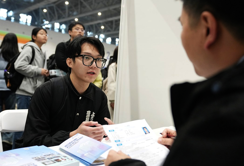 3月14日,求职者与招聘方工作人员在2026“起跑春天”杭州青年人才交流大会上洽谈。