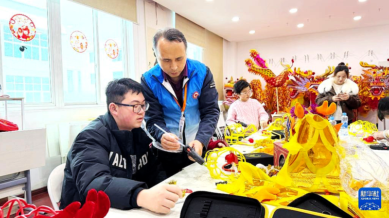 2月24日,在江西南昌城南龙灯非遗工坊,传承人史克滨(左二)教学生制作彩带龙。新华社发