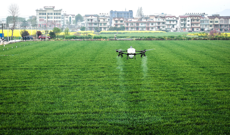 眼下正值小麦病虫害防控关键期,贵池区殷汇镇抢抓农时,大力推广无人机飞防等技术,精准开展病虫害统防统治,以科技赋能粮食生产。图为专业技术人员操控植保无人机进行飞防作业。记者 左泽川 摄
