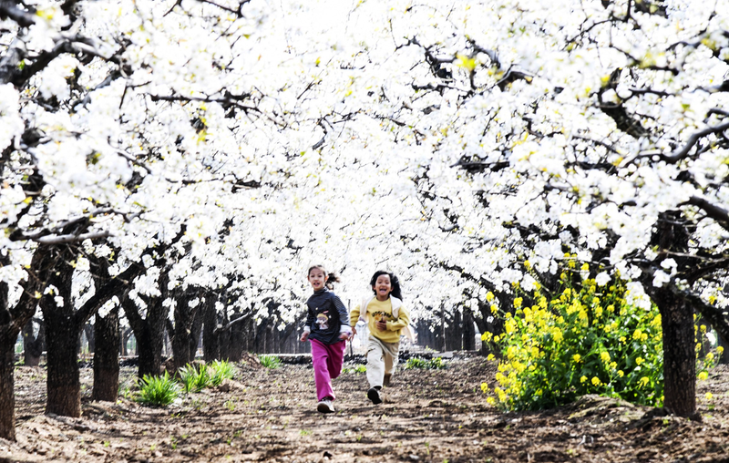 3月29日,小朋友在河南省济源市五龙口镇马村梨园赏花游玩。