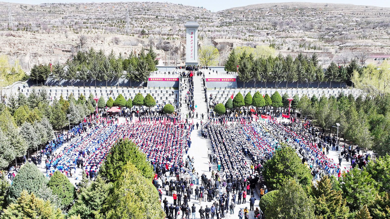 2026年4月3日,宁夏固原二中和弘文中学等学校师生及各界人士在位于彭阳县的任山河烈士陵园开展祭奠活动(无人机照片)。 新华社记者 王鹏 摄