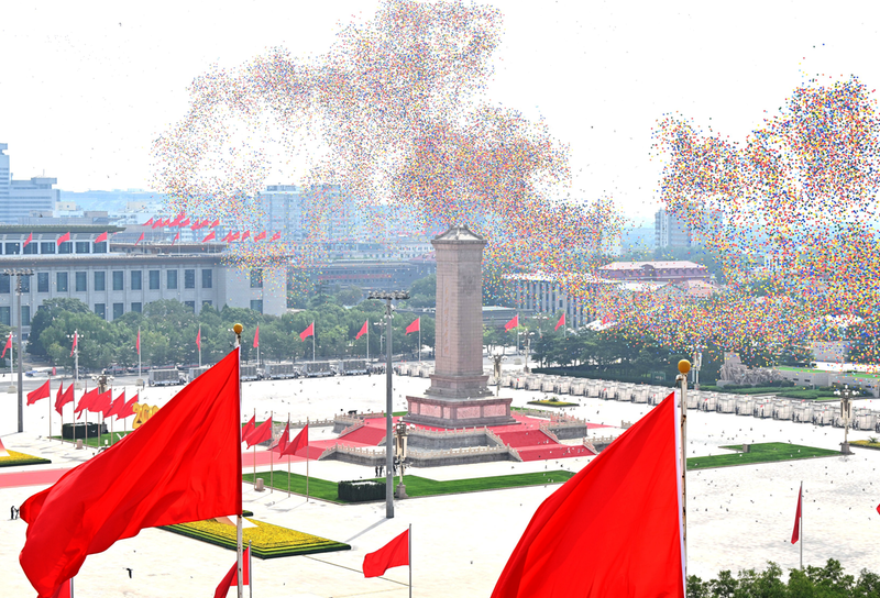 2025年9月3日,纪念中国人民抗日战争暨世界反法西斯战争胜利80周年大会在北京隆重举行。这是纪念大会现场放飞和平鸽和气球。新华社记者 李响 摄
