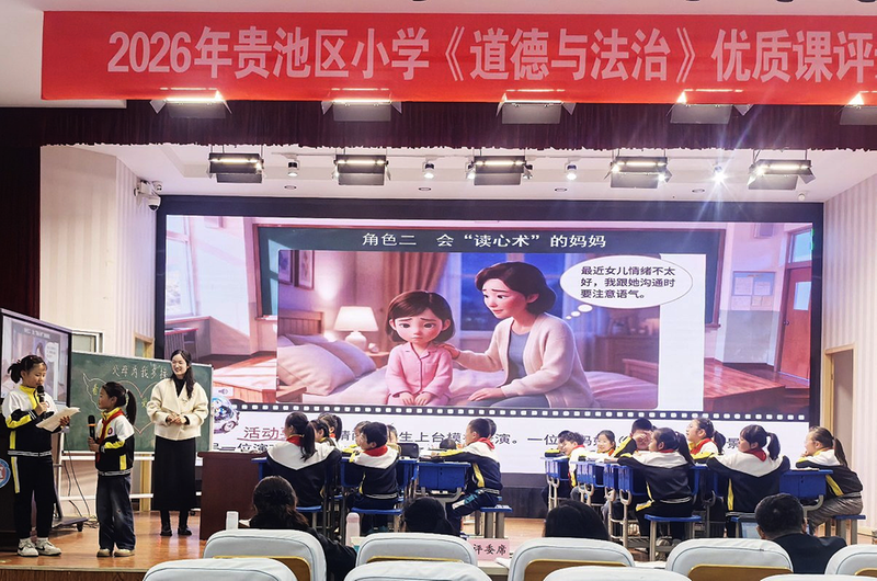 2026贵池区小学道德与法治优质课评比活动近日在南湖小学举行。活动包含说课与课堂展示两大板块,13位教师说课精彩纷呈,四位入围教师打造高效思政课堂,将代表贵池区征战市级比赛。图为杏花村实验学校陈慧慧老师正在进行课堂展示比赛。 通讯员 杜荣宝 摄