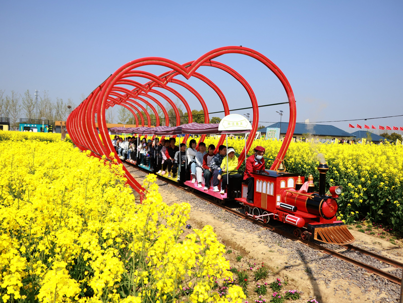 4月4日,游客在江苏省盱眙县黄花塘镇向阳花海乘坐小火车游玩。 新华社发