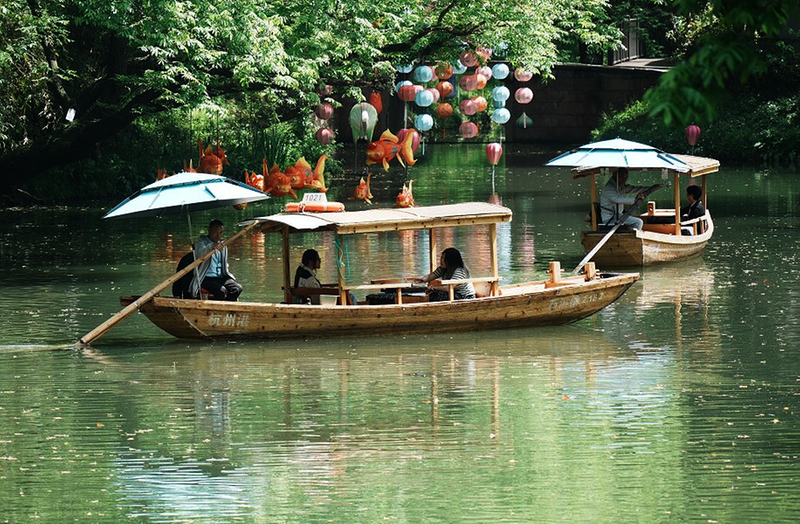 4月5日,游客乘船游览杭州西溪国家湿地公园。新华社发