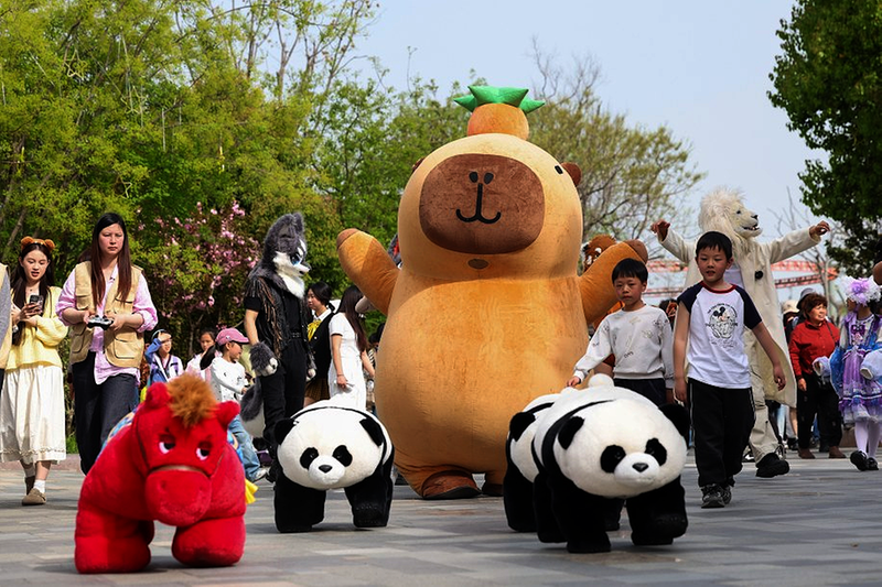 4月4日,游客在湖北省襄阳市华侨城奇幻谷景区观看神奇动物大迁徙巡游表演。 新华社发