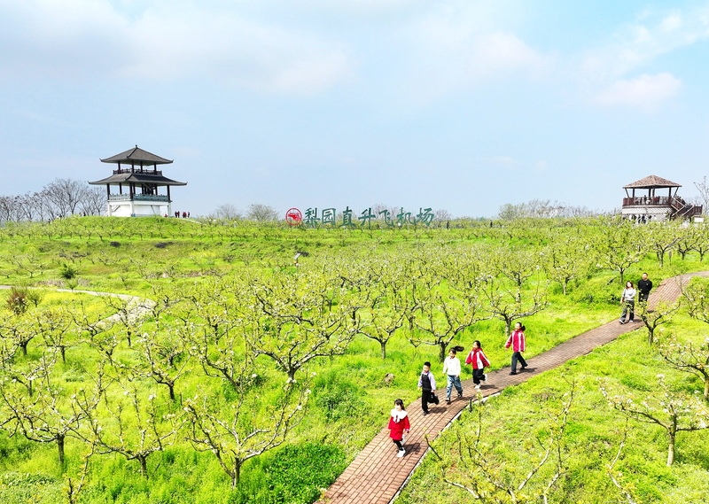 4月1日,小朋友在湖南省衡阳市珠晖区金甲梨园踏青游玩,乐享春假好时光(无人机照片)。新华社发(曹正平 摄)