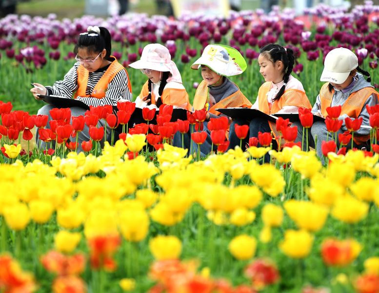4月1日,在安徽巢湖经济开发区半汤郁金香高地,小朋友参加春假写生活动。新华社发(马丰成 摄)