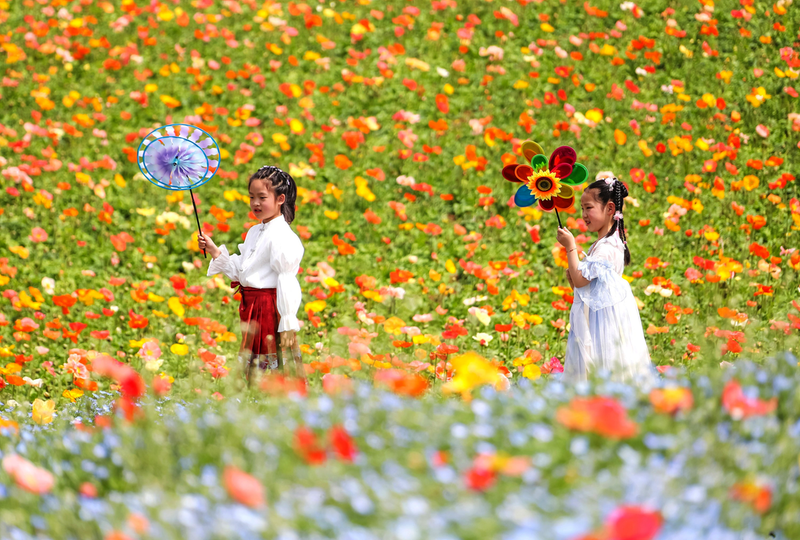 4月4日,小朋友在江苏省句容市白兔镇伏热花海玩耍。 新华社发(钟学满 摄)