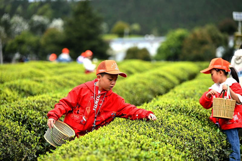 4月1日,小朋友在贵州省贵阳市开阳县龙岗镇坝子村生态茶园体验采摘春茶。新华社发(袁福洪 摄)