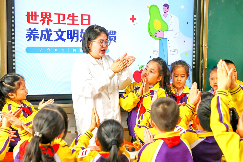 4月7日,在天津市滨海新区塘沽紫云小学,老师指导学生们学习“七步洗手法”。新华社发