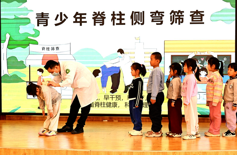 4月7日,在河北省石家庄市新华区柏林幼儿园,专业医护人员为小朋友进行脊柱侧弯筛查。 新华社发