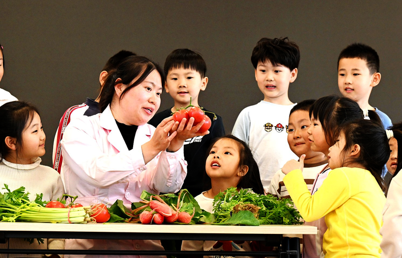4月7日,在河北省石家庄市新华区柏林幼儿园,校医通过趣味食育课堂引导幼儿养成健康饮食习惯。 新华社发