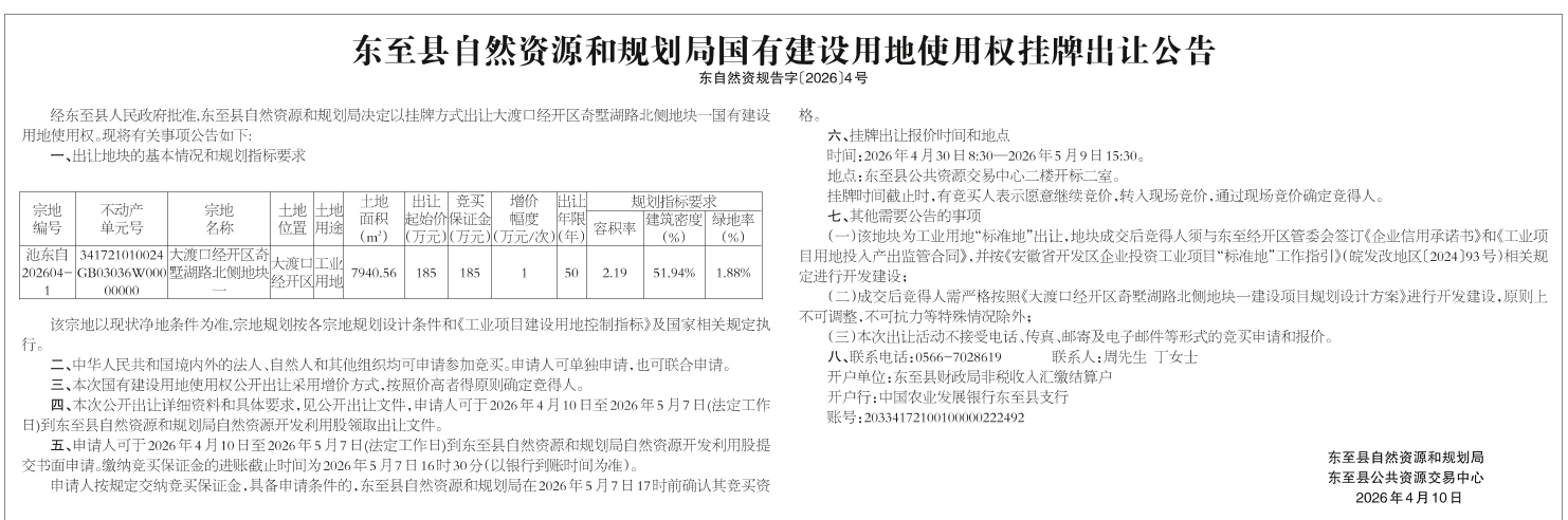 东至县自然资源和规划局国有建设用地使用权挂牌出让公告