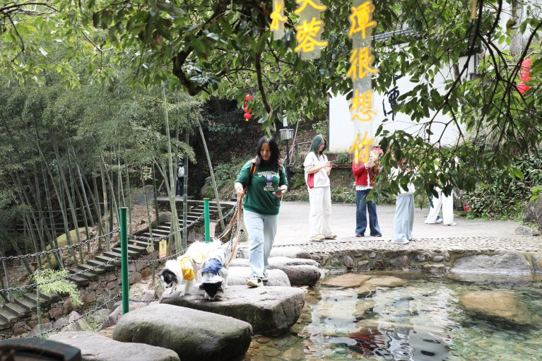 更让他惊喜的是,除了钟灵毓秀的自然风光,九子岩景区还在各景点巧妙融入宠物元素,藏满对“毛孩子”的贴心关怀。“我一直很喜欢小动物,在这里游玩,随处可见可爱的‘毛孩子’,让山水之旅更添一份治愈与温情。”