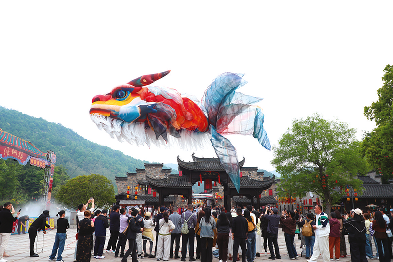 近日,贵池区九华天池傩仙镇景区推出“鳌鱼飞天”表演活动。22米巨型鳌鱼灯昂首升空,红鳞彩羽在夜色中格外夺目,与地面灵动的小鱼灯巡游交相辉映。