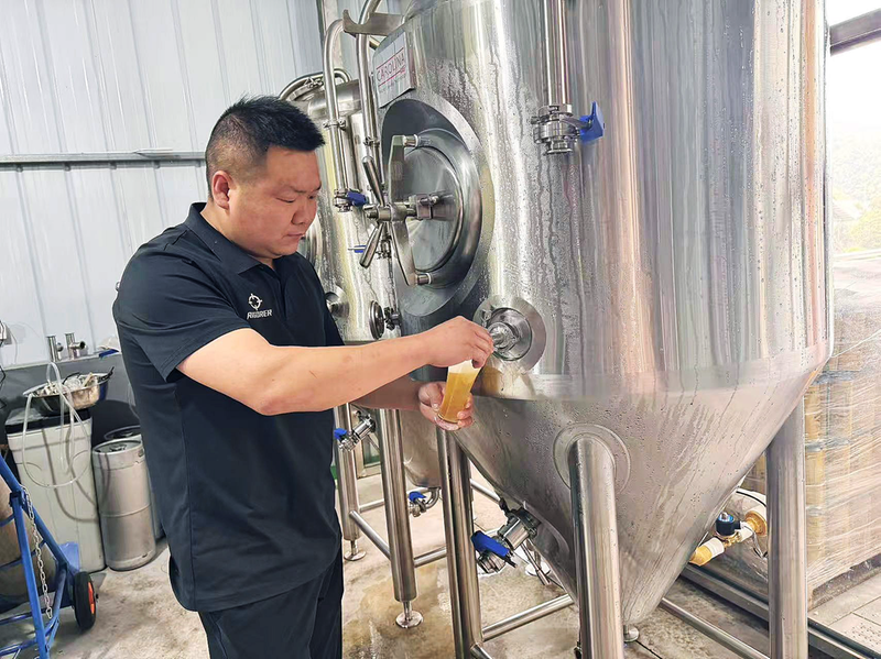 王超从发酵罐中倒出硒醇精酿啤酒。